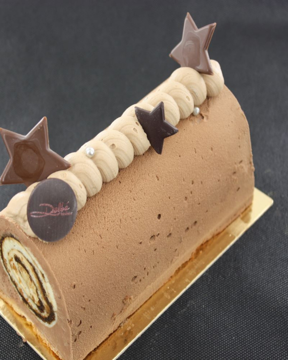 Mousse au chocolat, biscuit viennois roulé punché café, crémeux praliné, sablé amandes, brésilienne