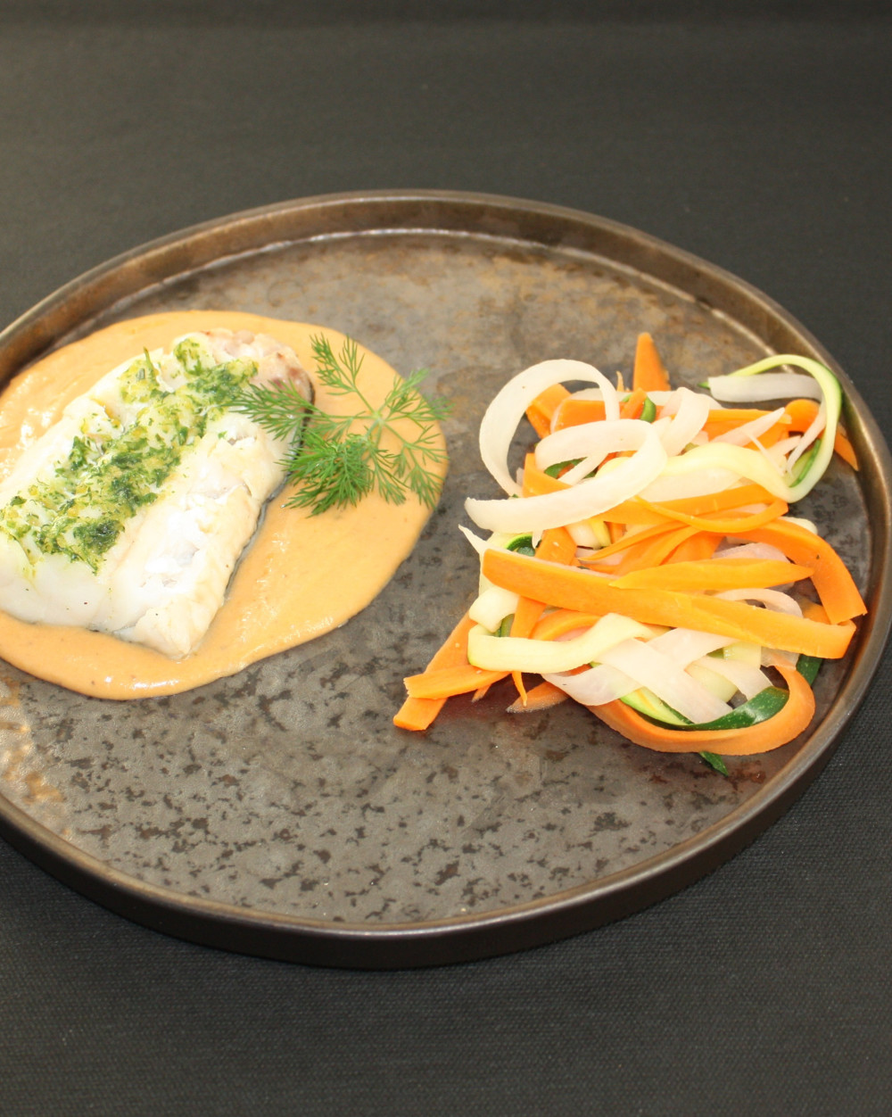 DOS DE CABILLAUD EN CROUTE D'HERBES, crème de langoustines, tagliatelles de légumes